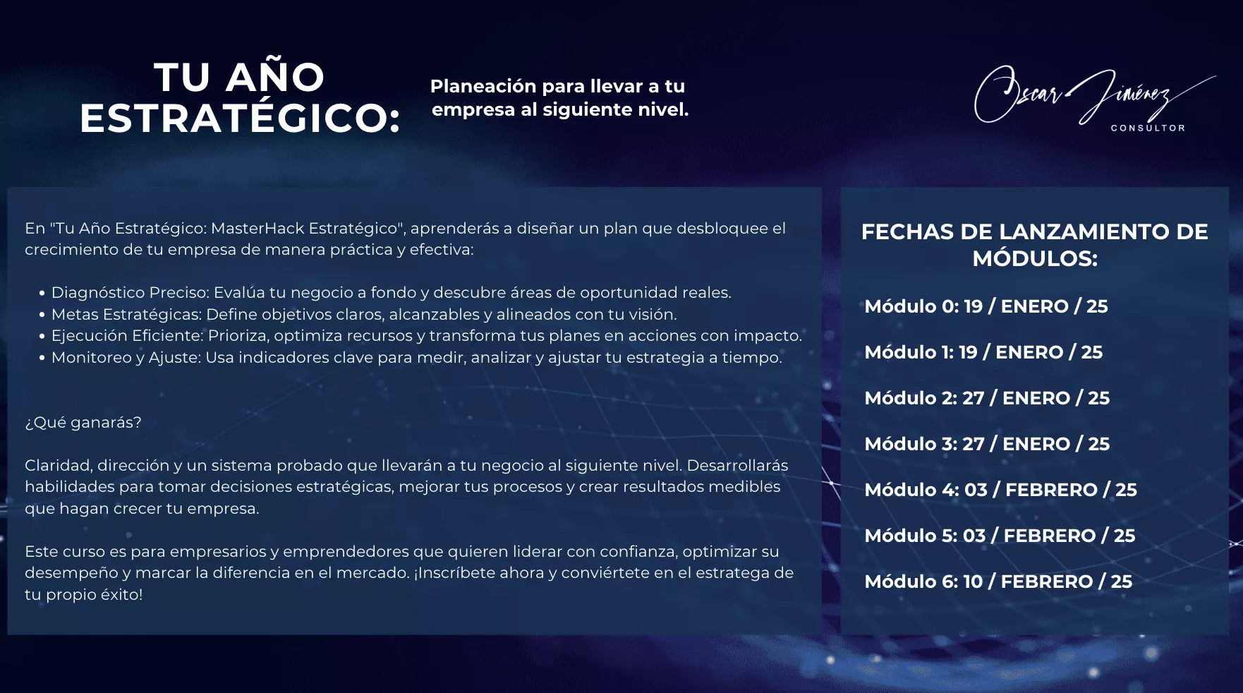 Con "Tu Año Estratégico: Planeación para llevar a tu empresa al siguiente nivel", descubrirás tu ventaja oculta y diagnosticarás tu negocio de manera innovadora. Este programa te ayudará a establecer objetivos ambiciosos y medibles, conectando tu visión empresarial con resultados tangibles. Utiliza herramientas y estrategias que transformarán tu operación y aprovecha indicadores clave para medir tu progreso. Si estás cansado de la rutina diaria y deseas dejar atrás la mediocridad, este programa es para ti. Inscríbete hoy y haz que el próximo año sea el más significativo de tu trayectoria empresarial.